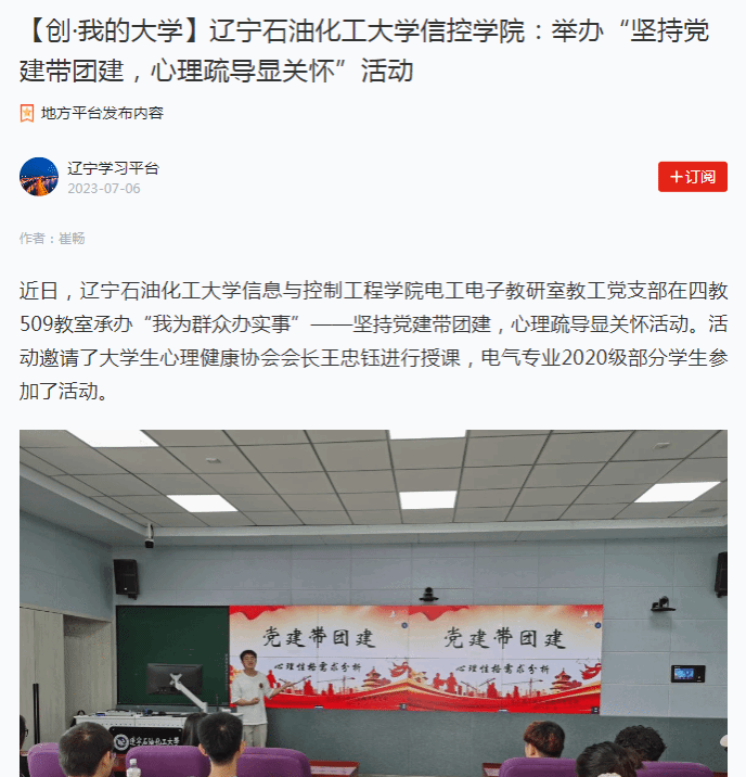编者按:近日,学习强国辽宁学习平台、辽宁日报·北国号对我校信息与控制工程学院电工电子教研室教工党支部在四教509教室承办“我为群众办实事”——坚持党建带团建,心理疏导显关怀活动。活动邀请了大学生心理健康协会会长王忠钰进行授课,电气专业2020级部分学生参加了活动进行了宣传报道。现将相关报道转载如下: