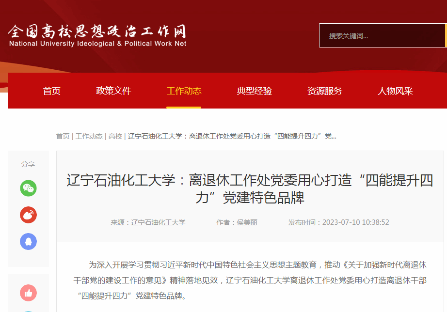 编者按:近日,全国高校思想政治工作网、辽宁日报·北国号等媒体平台对我校离退休工作处党委用心打造“四能提升四力”党建特色品牌进行了宣传报道。现将相关报道转载如下: