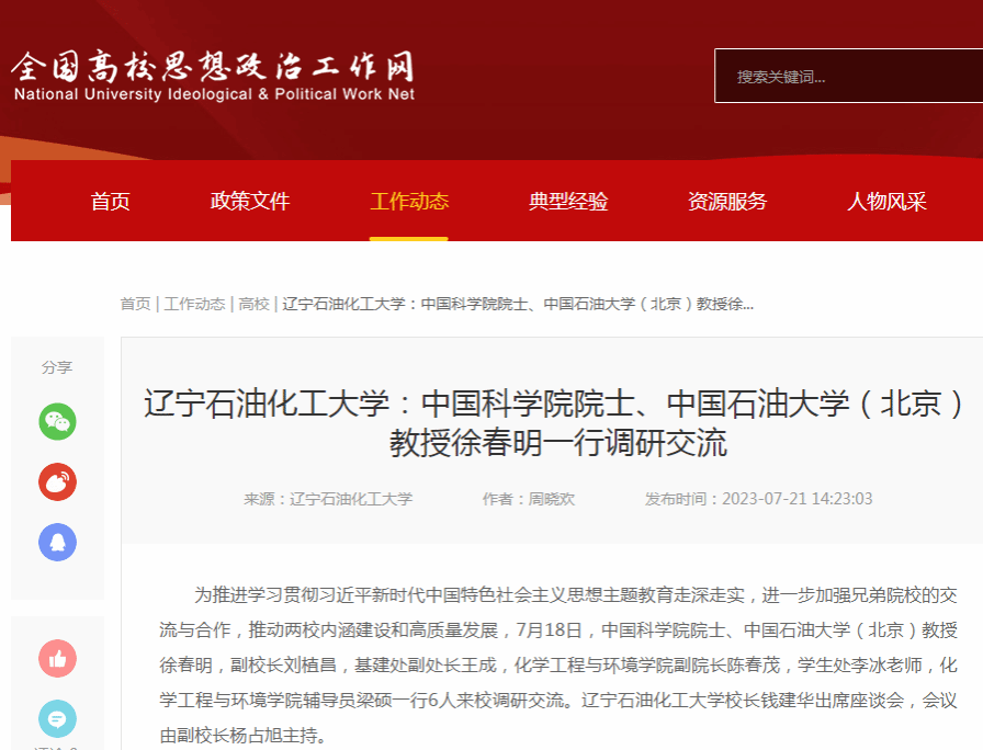 编者按:近日,全国高校思想政治工作网、辽宁日报·北国号、人民日报客户端·人民号等媒体平台对中国科学院院士、中国石油大学(北京)教授徐春明,副校长刘植昌,基建处副处长王成,化学工程与环境学院副院长陈春茂,学生处李冰老师,化学工程与环境学院辅导员梁硕一行6人来我校调研交流,进一步加强兄弟院校的交流与合作,推动两校内涵建设和高质量发展进行了宣传报道。现将相关报道转载如下: