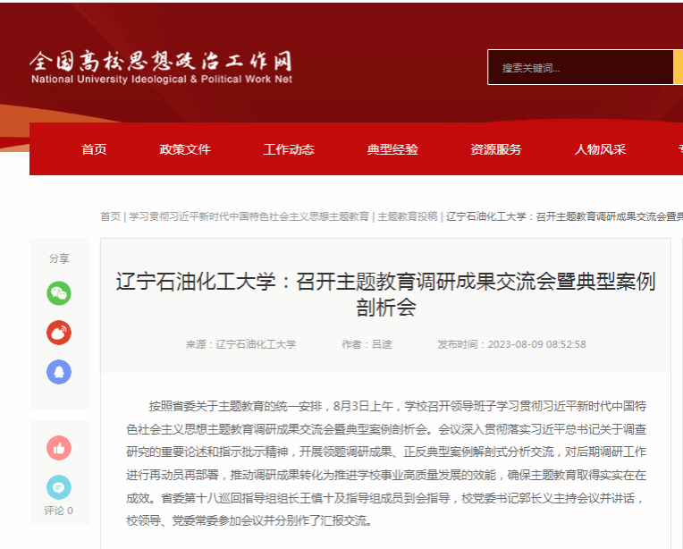 编者按:近日,全国高校思想政治工作网、辽宁日报·北国号等媒体平台对我校召开领导班子主题教育调研成果交流会暨典型案例剖析会。会议开展领题调研成果、正反典型案例解剖式分析交流,对后期调研工作进行再动员再部署,推动调研成果转化为推进学校事业高质量发展的效能,确保主题教育取得实实在在成效进行了宣传报道。现将相关报道转载如下:
