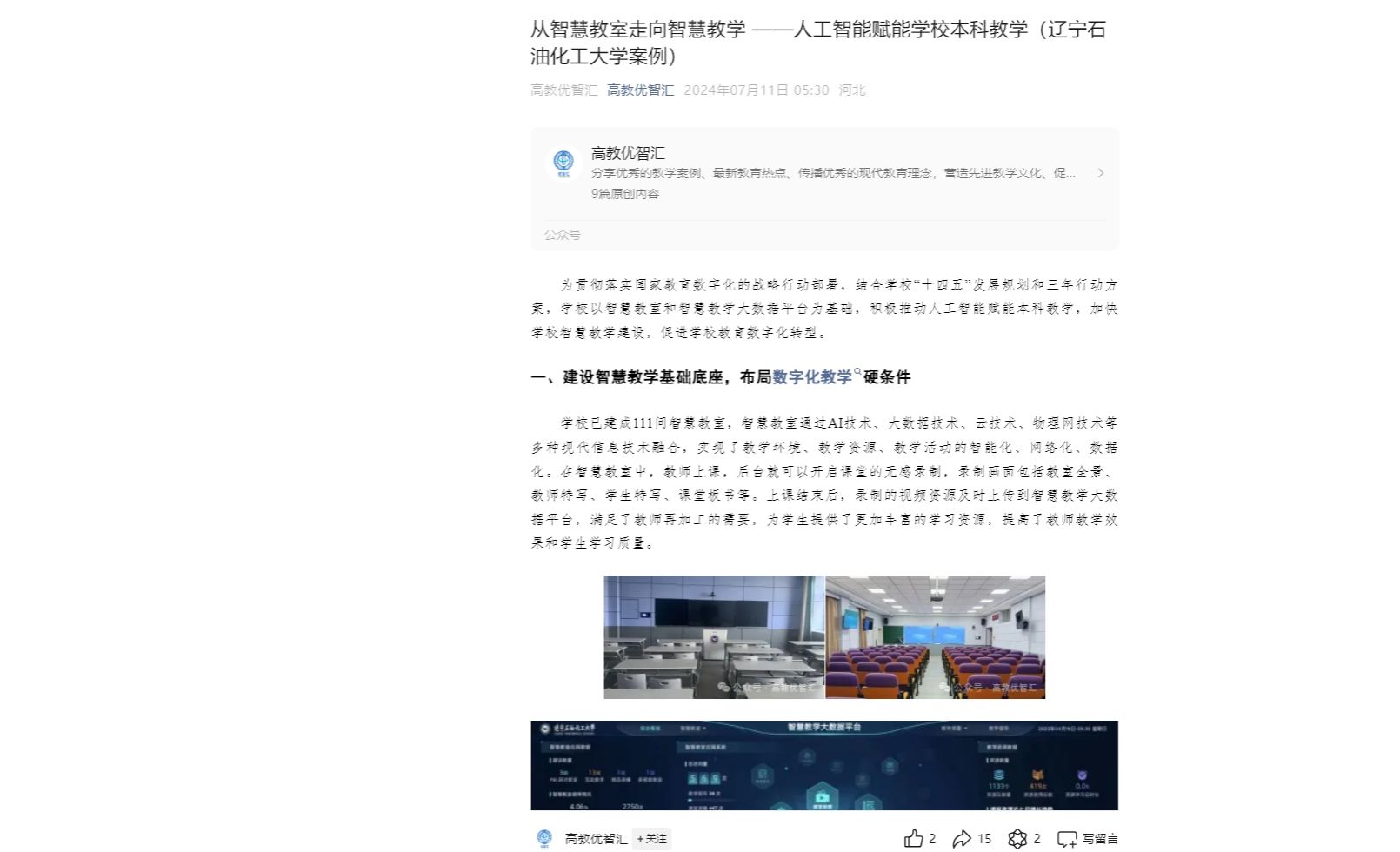编者按:7月11日,高教优智汇微信公众号对我校为贯彻落实国家教育数字化的战略行动部署,结合学校“十四五”发展规划和三年行动方案,以智慧教室和智慧教学大数据平台为基础,积极推动人工智能赋能本科教学,加快学校智慧教学建设,促进学校教育数字化转型进行了宣传报道。现将相关报道转载如下: