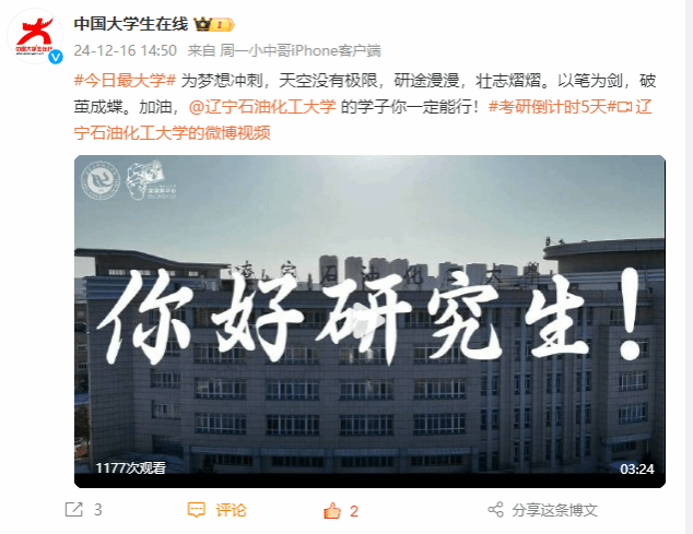 编者按:考研倒计时5天,学校新媒体中心制作视频祝福学子考研成功。教育部中国大学生在线官方微博对此进行了转发宣传。现将相关报道转载如下: