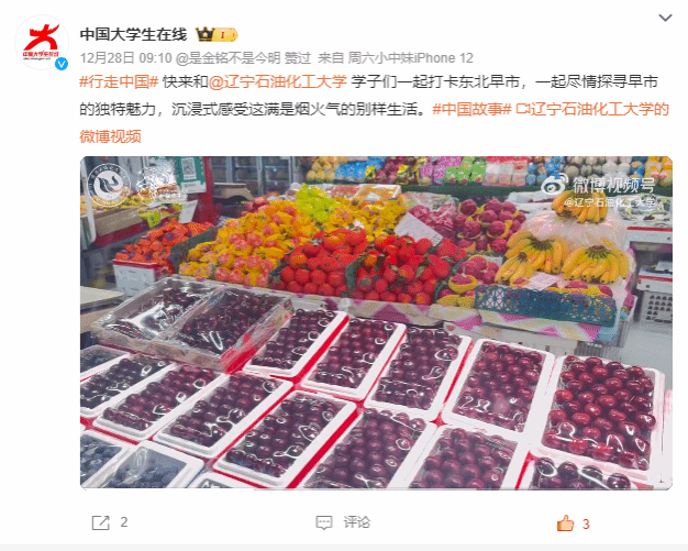 编者按:12月28日,教育部中国大学生在线官方微博转发我校新媒体学生制作的打卡东北早市视频。现将相关报道转载如下: