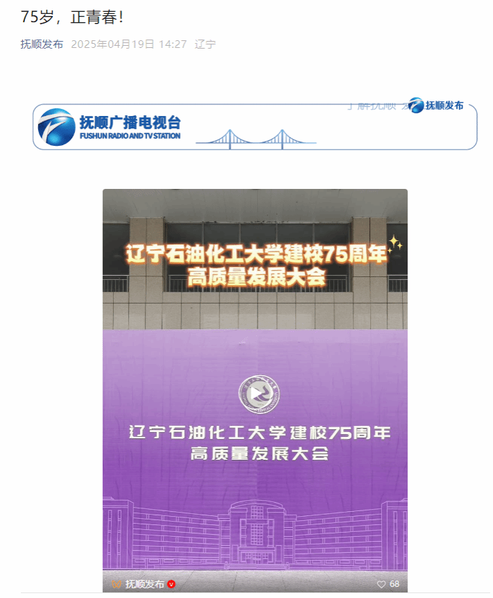 编者按:4月19日,学校迎来建校75周年。一场高质量发展大会在校园内举行,各界嘉宾、校友和师生代表齐聚一堂,共同回顾光辉历程,展望未来蓝图。抚顺发布微信公众号以《75岁,正青春!》对学校建校75周年高质量发展大会进行了宣传报道。现将相关报道转载如下: