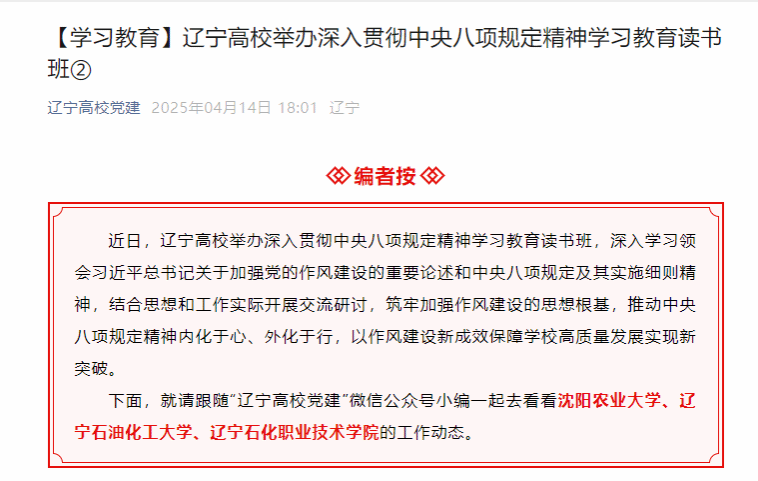 编者按:近日,辽宁高校举办深入贯彻中央八项规定精神学习教育读书班,深入学习领会习近平总书记关于加强党的作风建设的重要论述和中央八项规定及其实施细则精神,结合思想和工作实际开展交流研讨,筑牢加强作风建设的思想根基,推动中央八项规定精神内化于心、外化于行,以作风建设新成效保障学校高质量发展实现新突破。4月14日,辽宁高校党建微信公众号对我校召开深入贯彻中央八项规定精神学习教育第1期读书班暨2025年党委理论学习中心组第六次集体学习会议进行了宣传报道。现将相关报道转载如下: